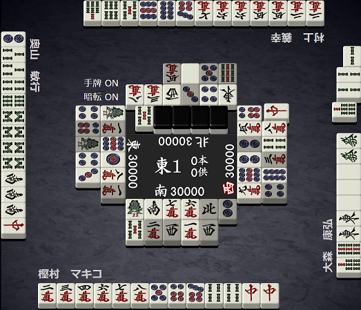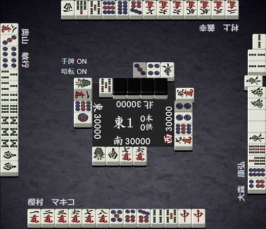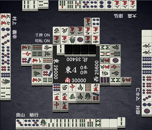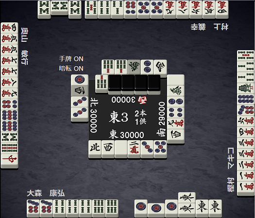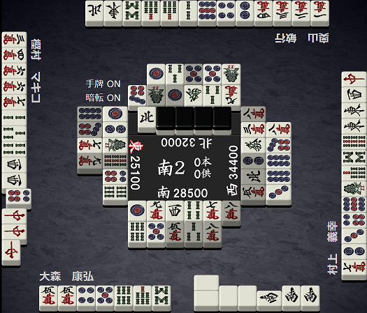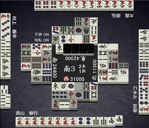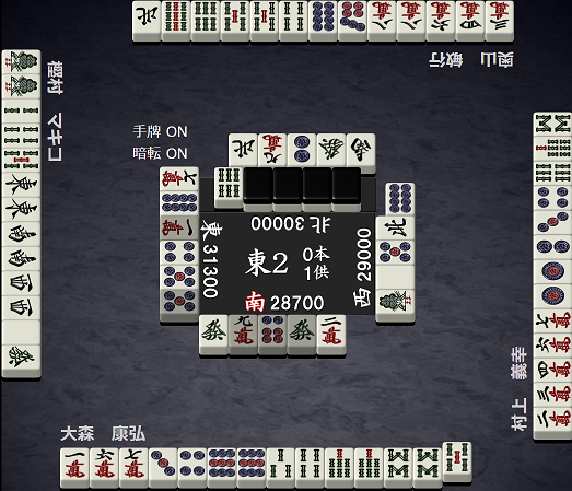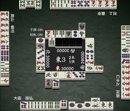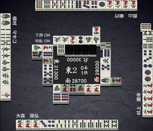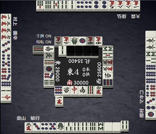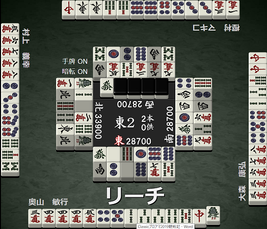 親の樫村は連荘、奥山はほぼ役満条件、大森は7700を村上からアガるか2000-3900をツモアガるか。しかしそう簡単に条件を満たす手は入らない。そしてアガリ連荘のClassicルールではアガリ続けるのは難しい。
