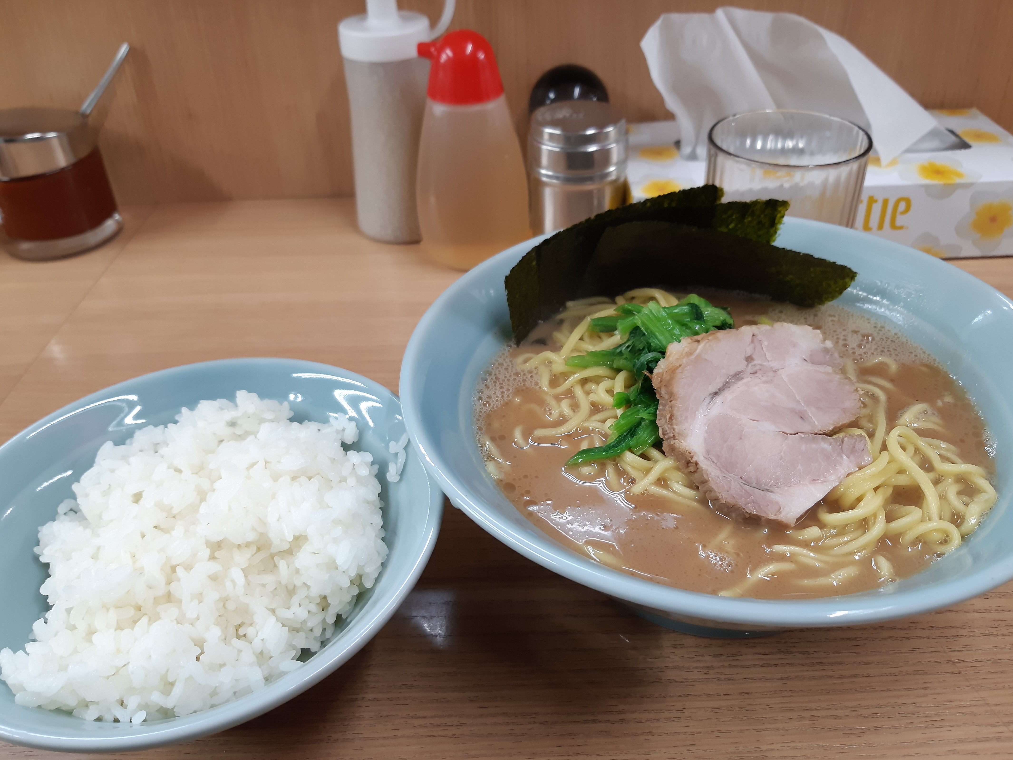 待ち合わせ場所の日吉駅付近にある球体のオブジェの前で待っていると、品川がやってきた。「おなか空いてない?とりあえずごはん行こうか!」と誘われるがままに、日吉駅から徒歩1分ほどにある武蔵家で横浜家系ラーメンを食らう。
