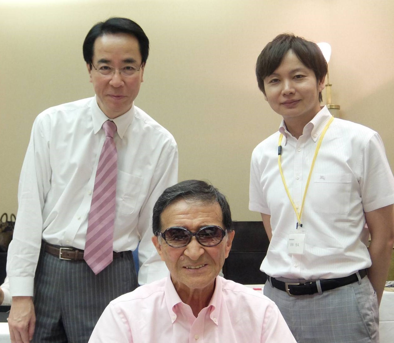 ホテルニューオータニの麻雀教室にて元プロ野球選手の佐々木信也氏と。左:土田、右:吉田