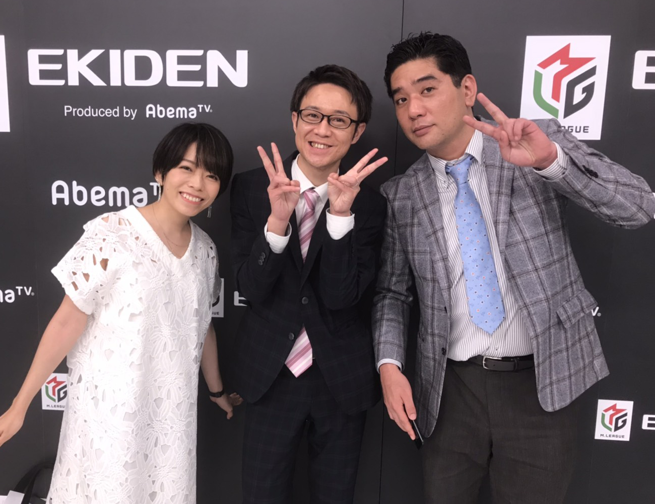 (2019Mリーグ駅伝の際の写真。左からMリーグ公式実況・小林未沙、河野、醍醐)
