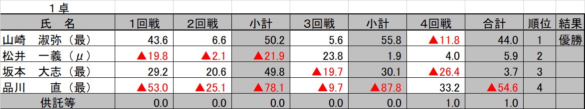 (第24回BIG1カップ決勝の最終成績。安定感のある麻雀で強豪3名を抑え、優勝を勝ち取った)