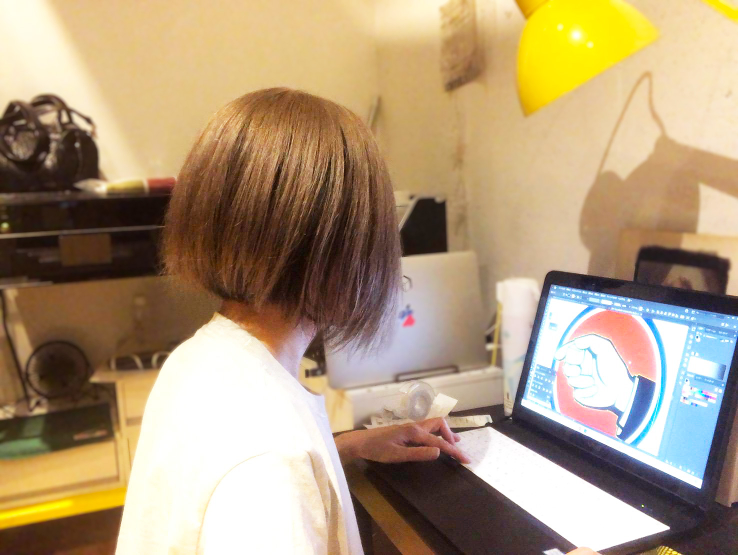 黄色いデスクライトが印象的な作業部屋でデザインはもちろんのこと、梱包や発送に至るまで、全てワンオペで切り盛りしている。梱包作業の様子が気になる方は、是非YouTubeのずむやchにて「ツモパーカーを爆速で梱包する動画」なるものをご覧いただきたい。大平の魅力とツッコミどころが多分に散りばめられていることがお分かりいただけるはずである。