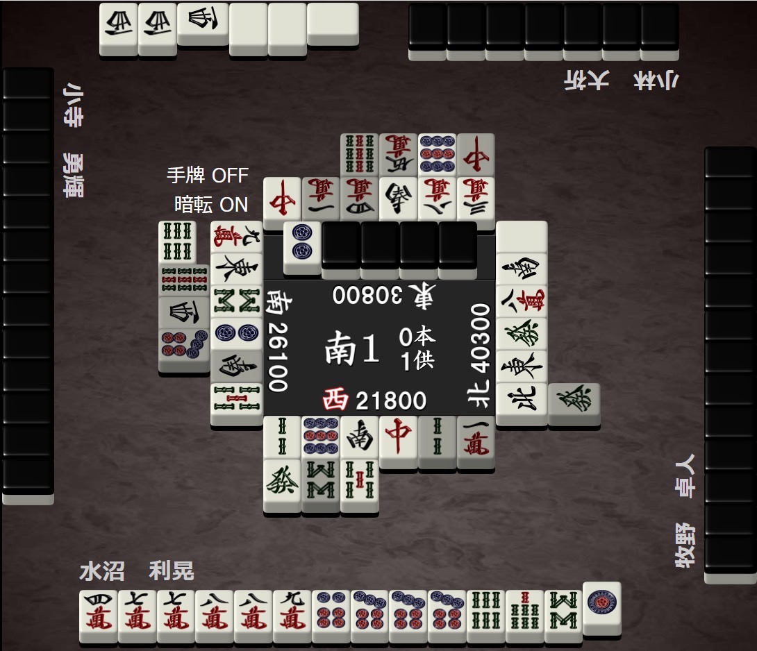 その後、牧野のタンヤオのみ、水沼のツモのみの和了で局が進み、点棒は平たいままで南場を迎える。