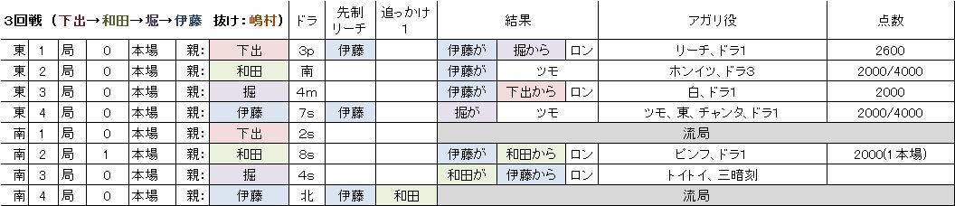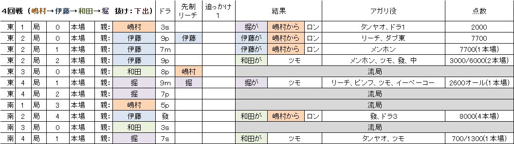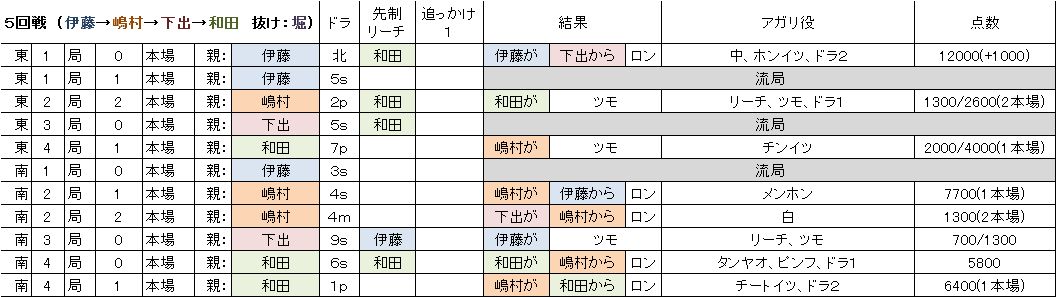 ●5回戦 起家から 伊藤→嶋村→下出→和田 (抜け:堀)