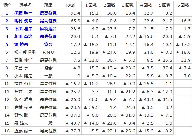 堀 +51.9 和田 +35.4 下出 +0.5 伊藤 △1.7 嶋村 △88.1