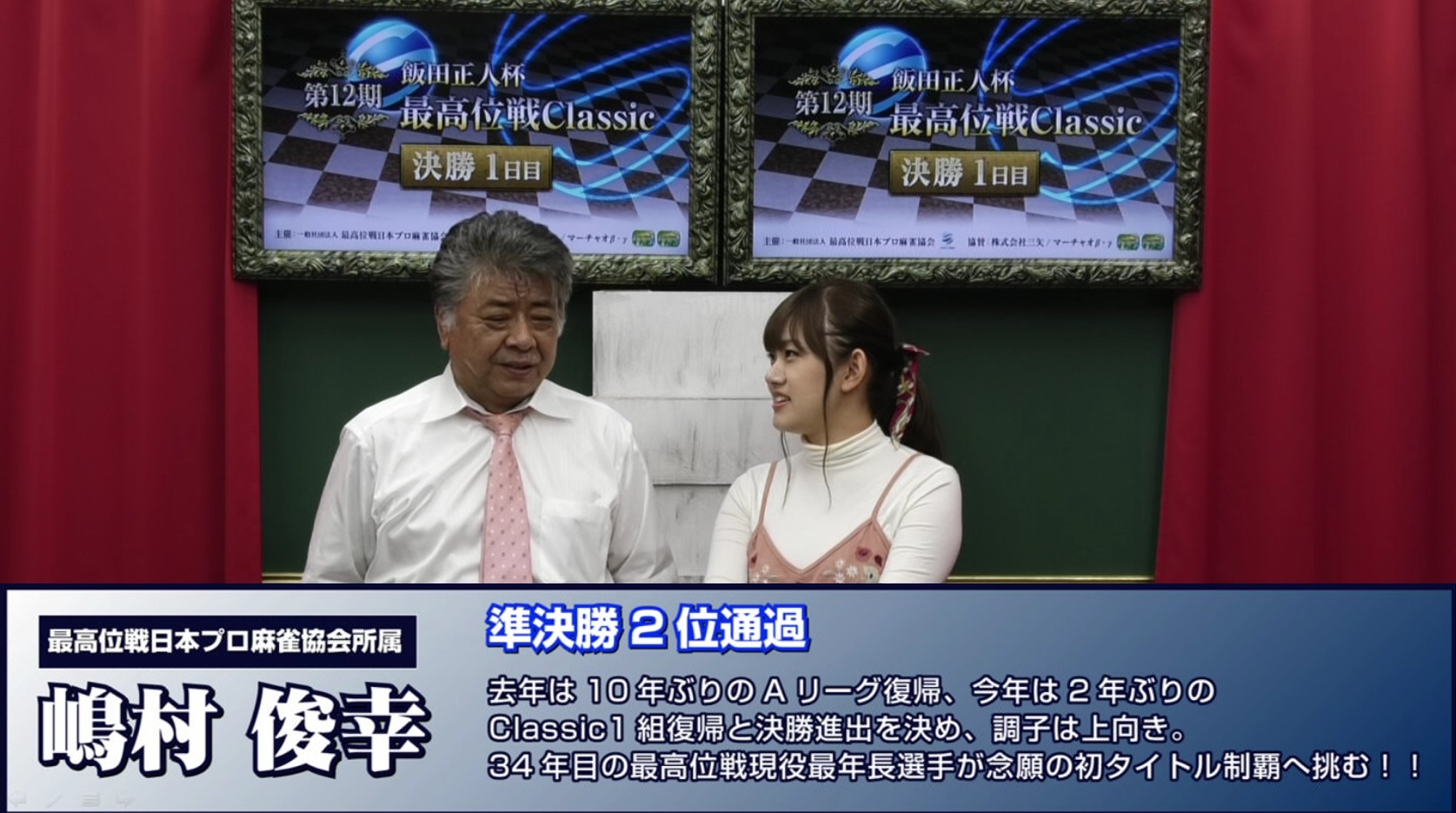 最高位戦には第9期入会。昭和26年生まれの66歳。昨年、魔境と言われるB1リーグからAリーグに10年ぶりに昇級。2017年の放送対局では、オーラストップ目でも、伏せずに続行するという熱い麻雀を見せつけている。最高位戦Classicでは、第2期に決勝に進み、タイトル名にもある飯田正人本人と熱戦をくりひろげた。(※第2期の優勝者は飯田正人)そんな最高位戦最年長Aリーガーである嶋村が、Classic決勝の舞台に戻ってきた。