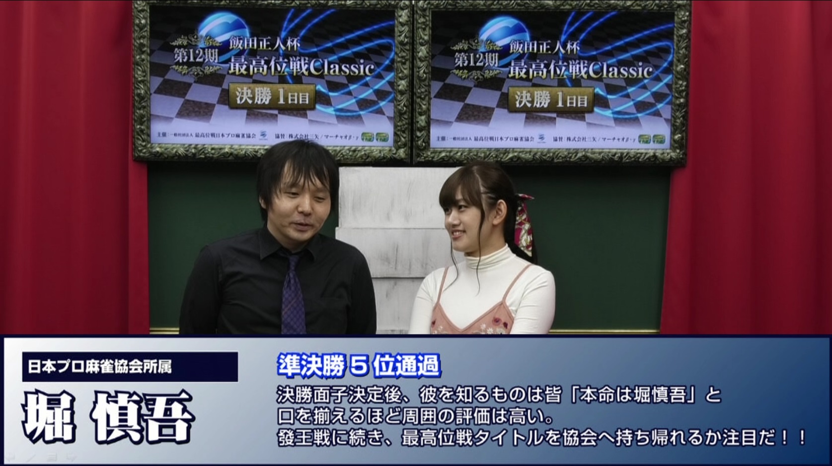 日本プロ麻雀協会所属。自団体だけでなく多くの麻雀関係者が「堀慎吾は本当に強い」「天才 堀慎吾」と称賛するほどの実力の持ち主。B1リーグに所属し、今年は第8節(全10節)終了時点で+321.7の2位という成績を出している。現發王位である松本吉弘選手に続き、Classicも協会に持ち帰ることができるか注目である。