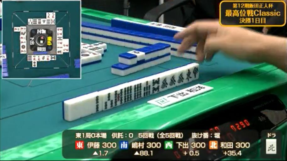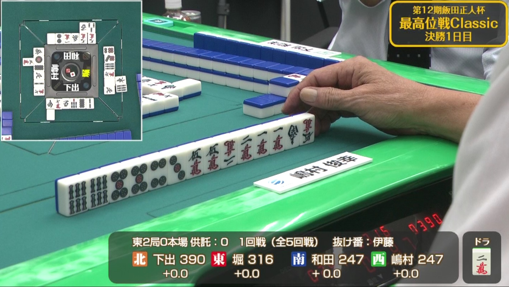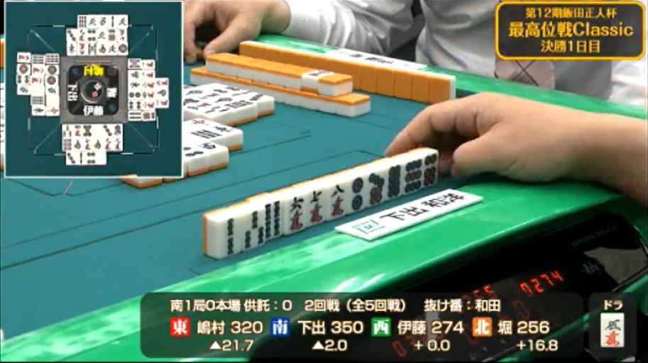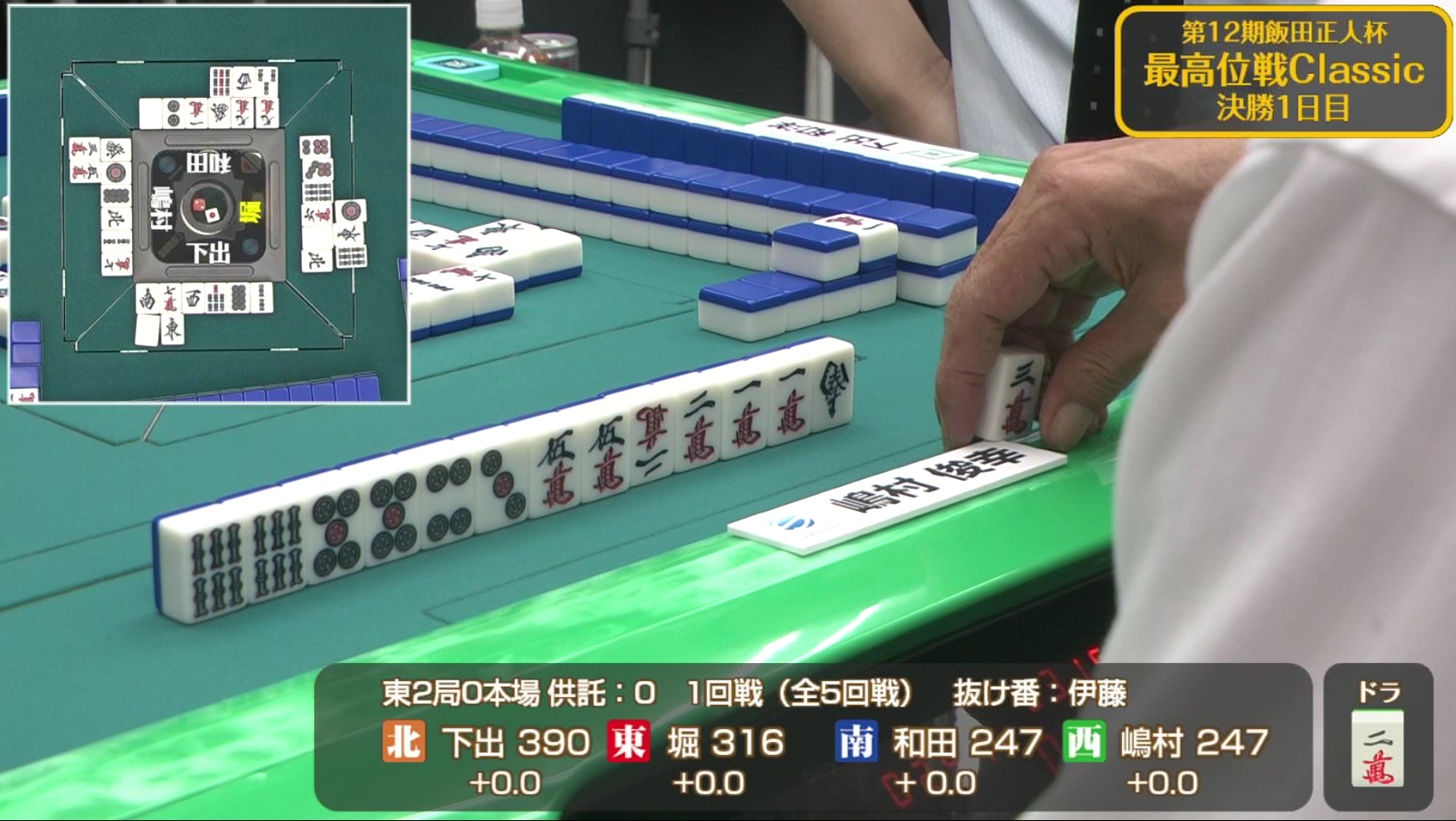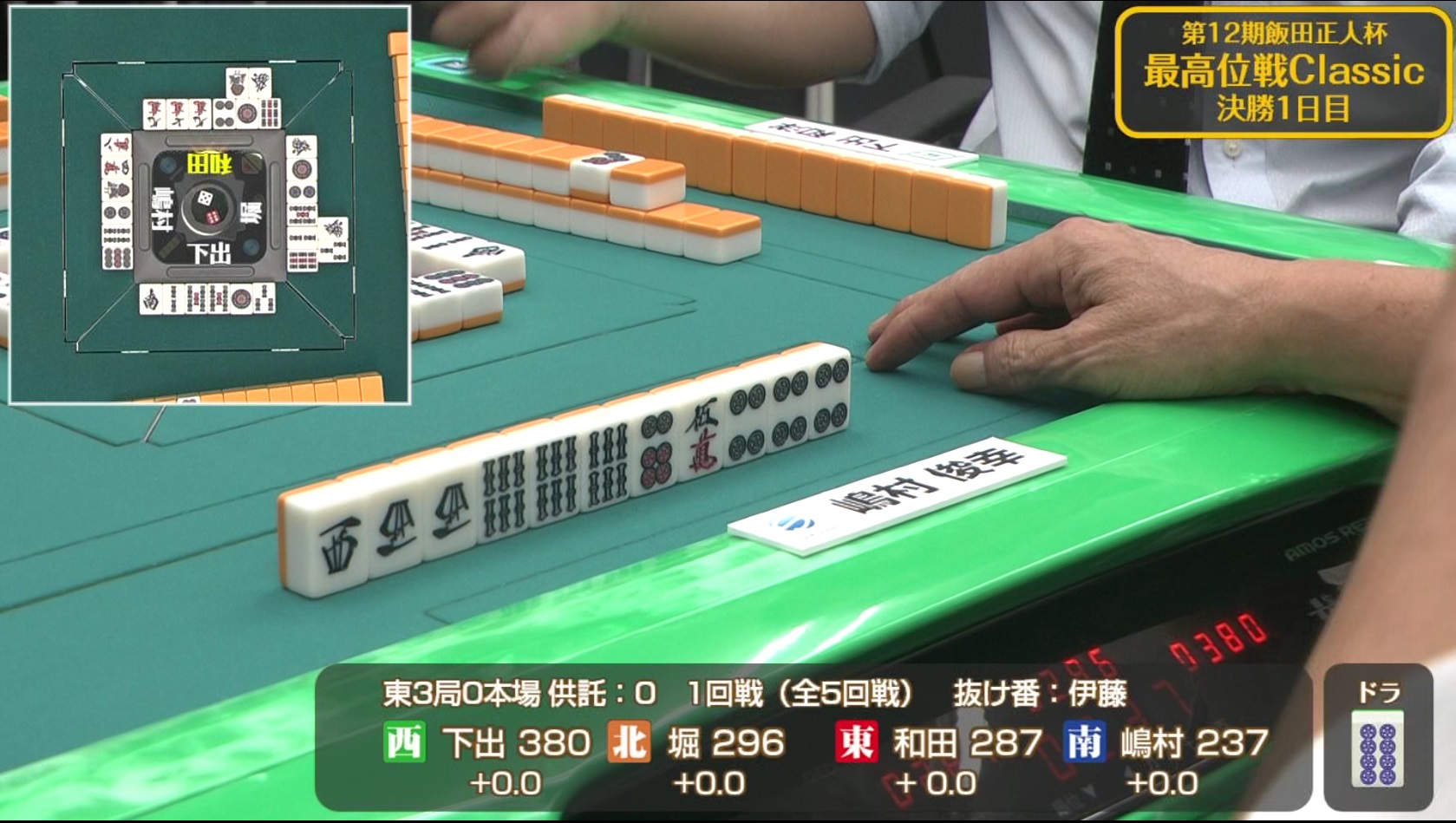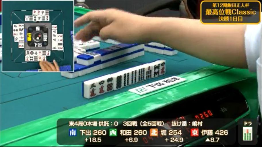 流局の多いClassicルール。せっかく3900オールをアガったのだからわざわざワンチャンスの牌やションパイを勝負する必要はない。「東1局の3900オールを守りきった下出が初戦トップ」で良いのである。これが下出の戦い方。Mr.Classicの経験をもとにした判断と言える。