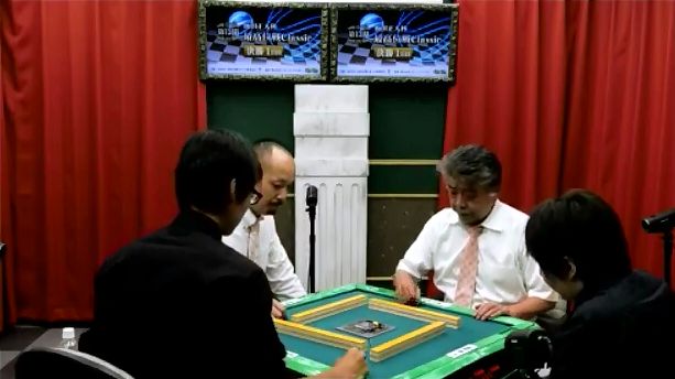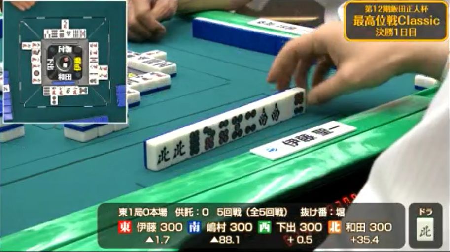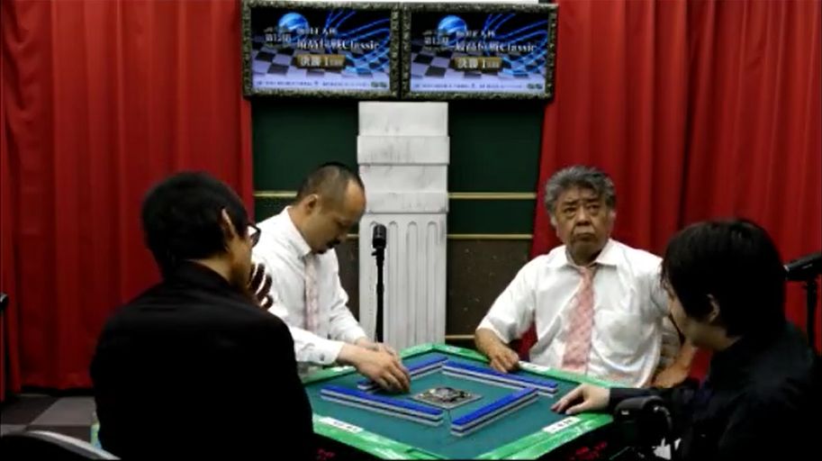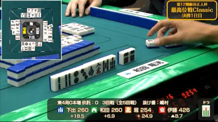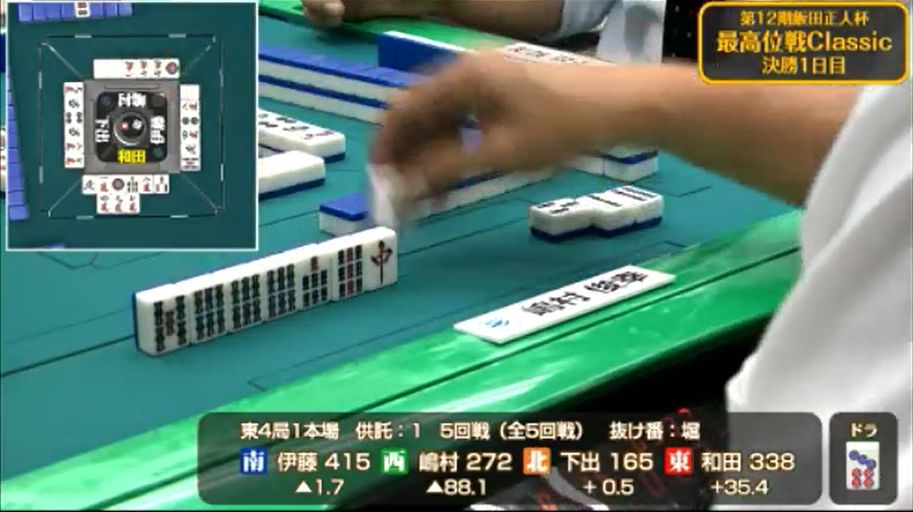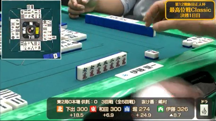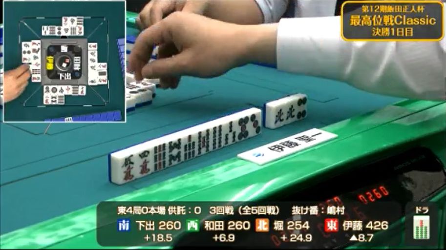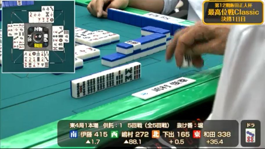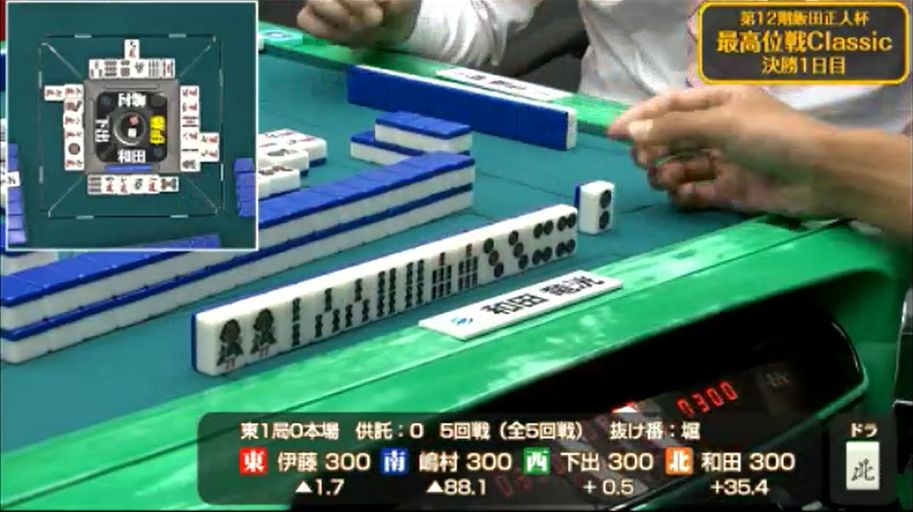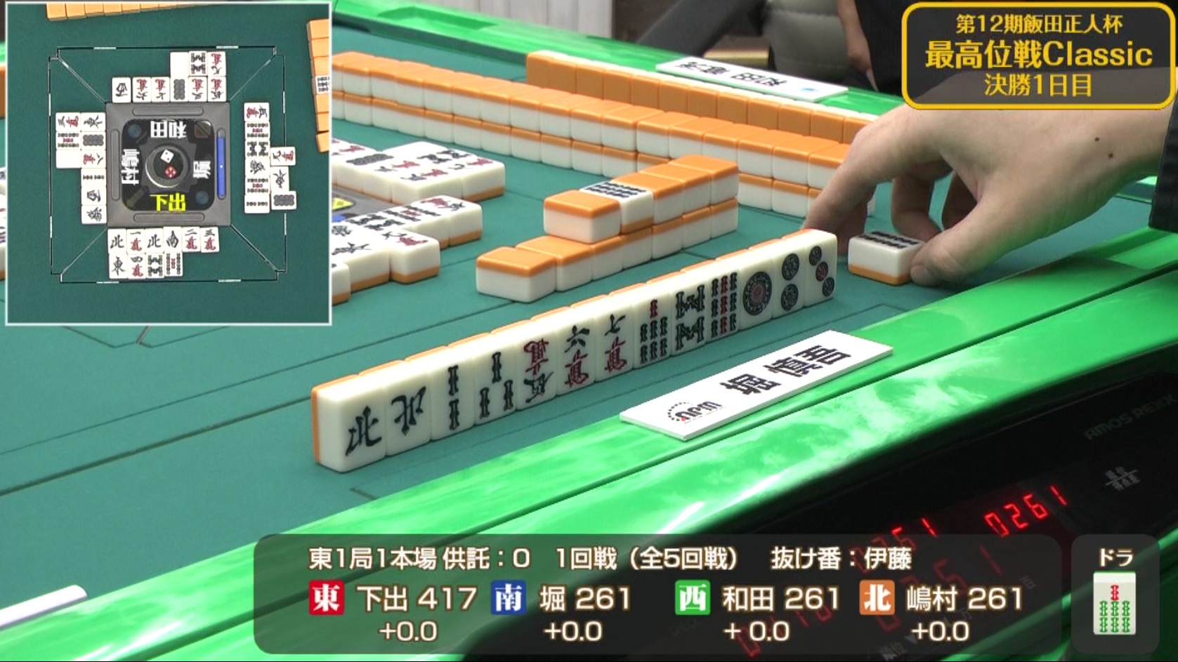 流局の多いClassicルール。せっかく3900オールをアガったのだからわざわざワンチャンスの牌やションパイを勝負する必要はない。「東1局の3900オールを守りきった下出が初戦トップ」で良いのである。これが下出の戦い方。Mr.Classicの経験をもとにした判断と言える。