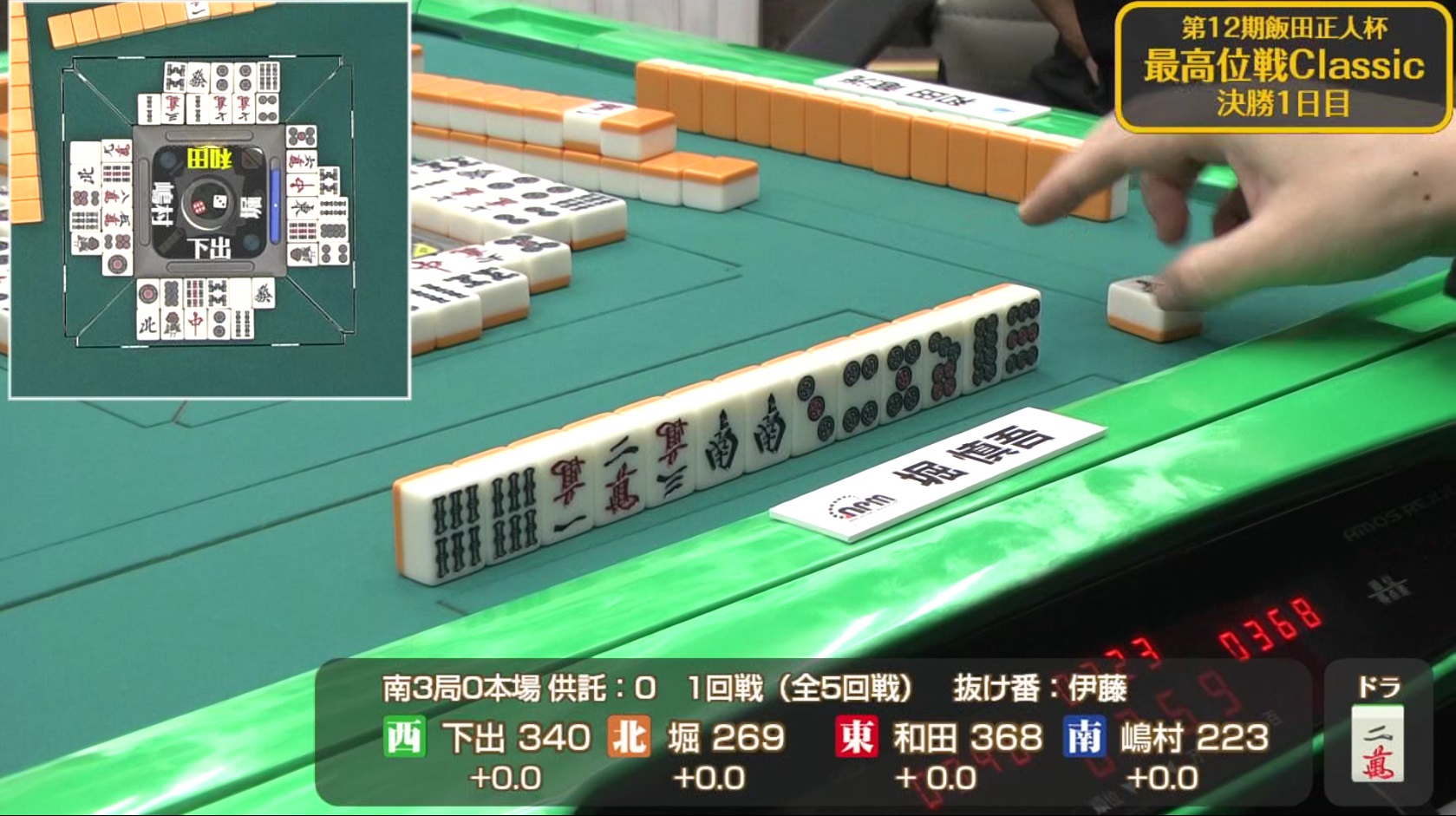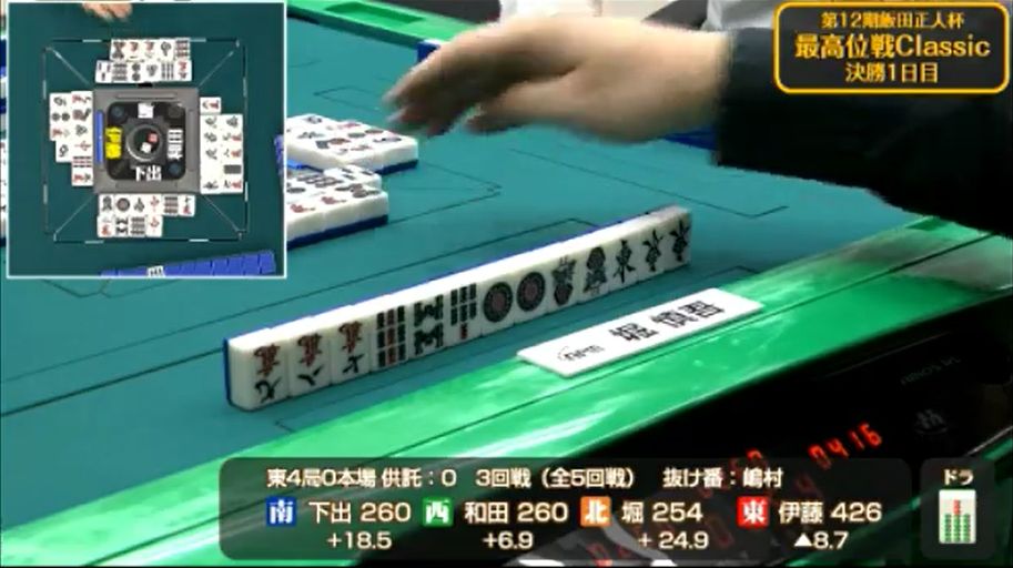 リーチ、ピンフ、ドラ1である。一時代前であれば、これをダマる選手も多かったのだろう。しかし堀はリーチを選択。しっかりと加点することを考え、当然のようにリーチを打った。