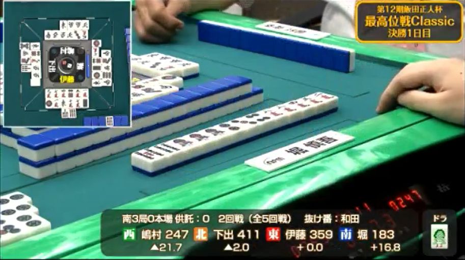 序盤、伊藤に勢いあったものの、中盤以降からは積極的に仕掛けた和田、堀がワンツーを決めた。嶋村にとっては、ただただつらい半荘となった。