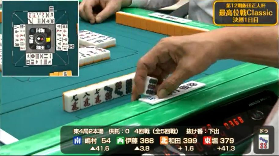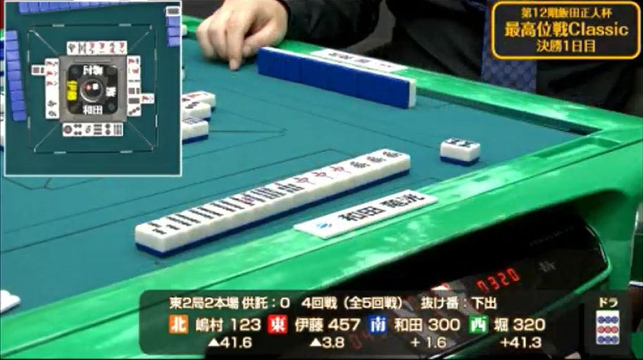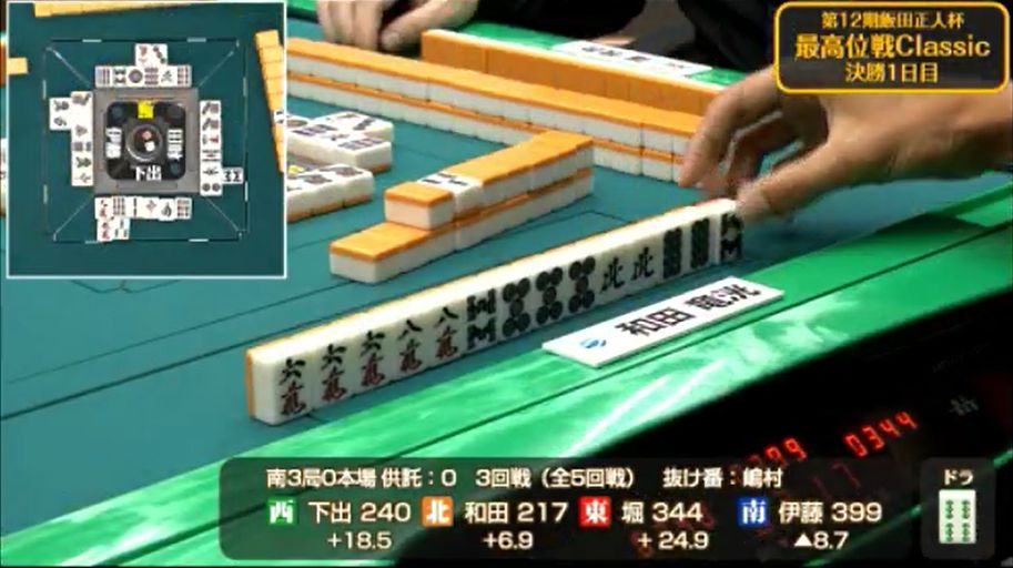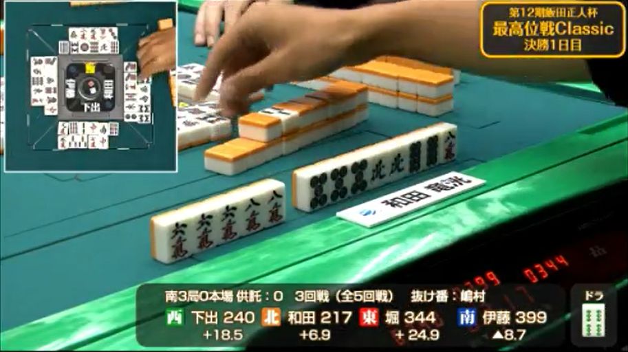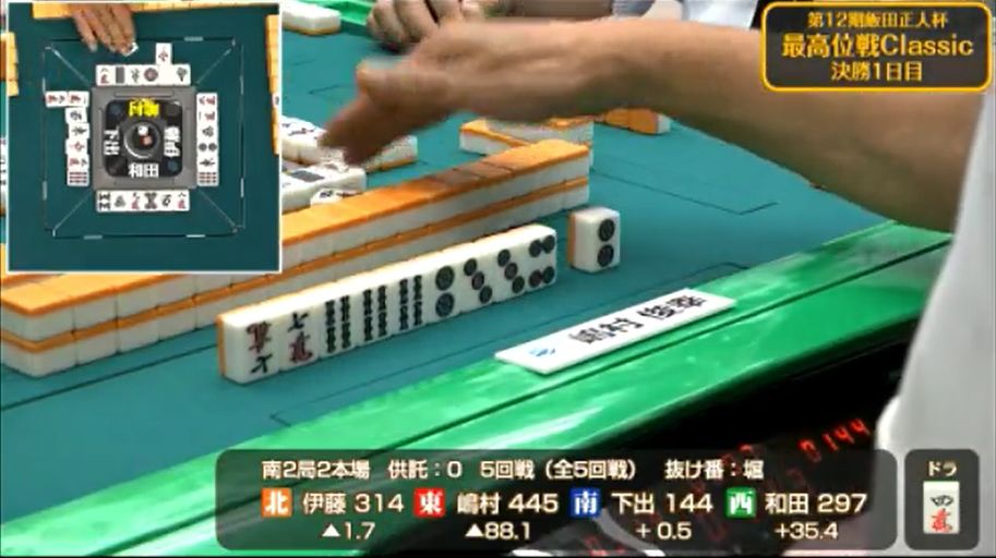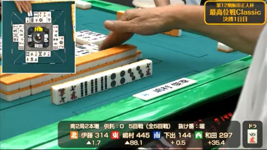 を西家の和田がポン。嶋村最後の親番を流しにいった。