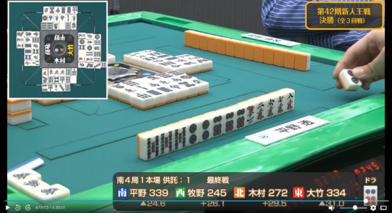 平野としても大竹からの和了は避けたいところであったが、大竹にオーラスの親番が残っていたこともあり渋々に倒したといったところか。