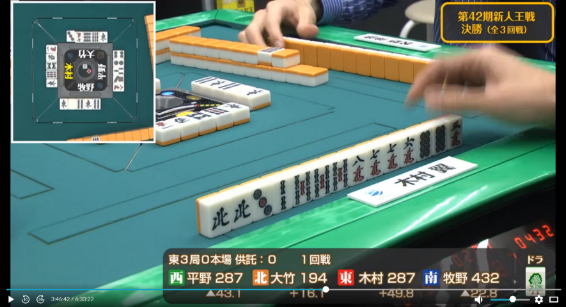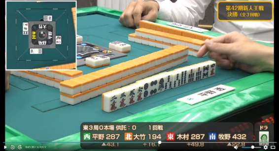 決勝3半荘を通して平野のリーチ判断の鋭さは光っていた。