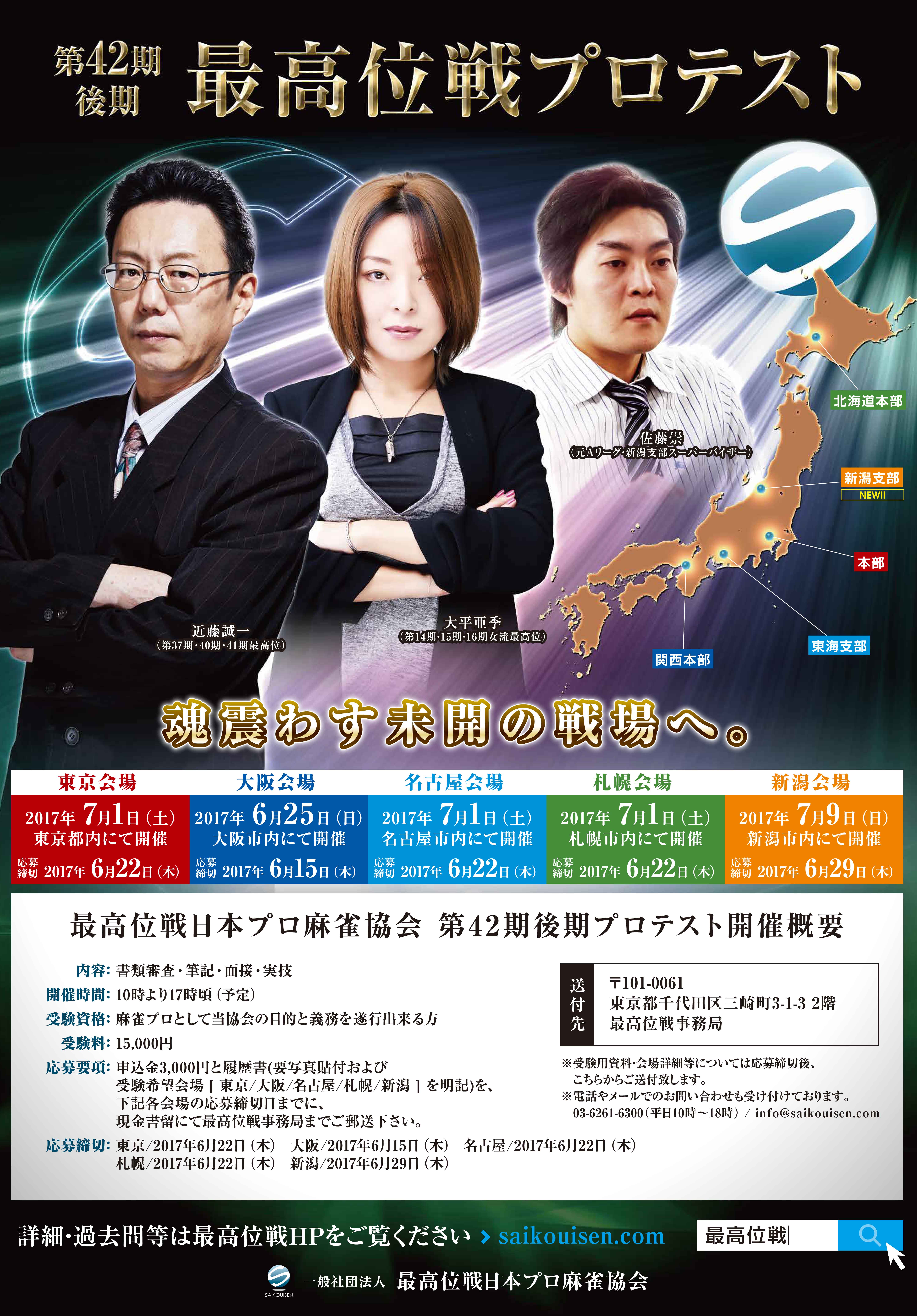 申込金3,000円と、履歴書(要写真貼付、新潟受験希望と明記)を、現金書留で最高位戦事務局まで御郵送下さい。