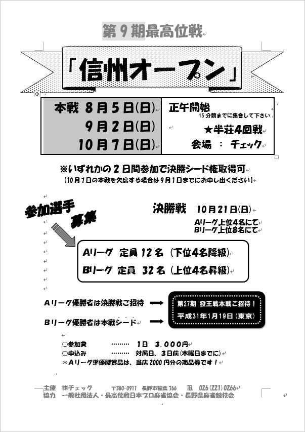 そして、いよいよ2018年8月より第9期最高位戦「信州オープン」を開催いたします!